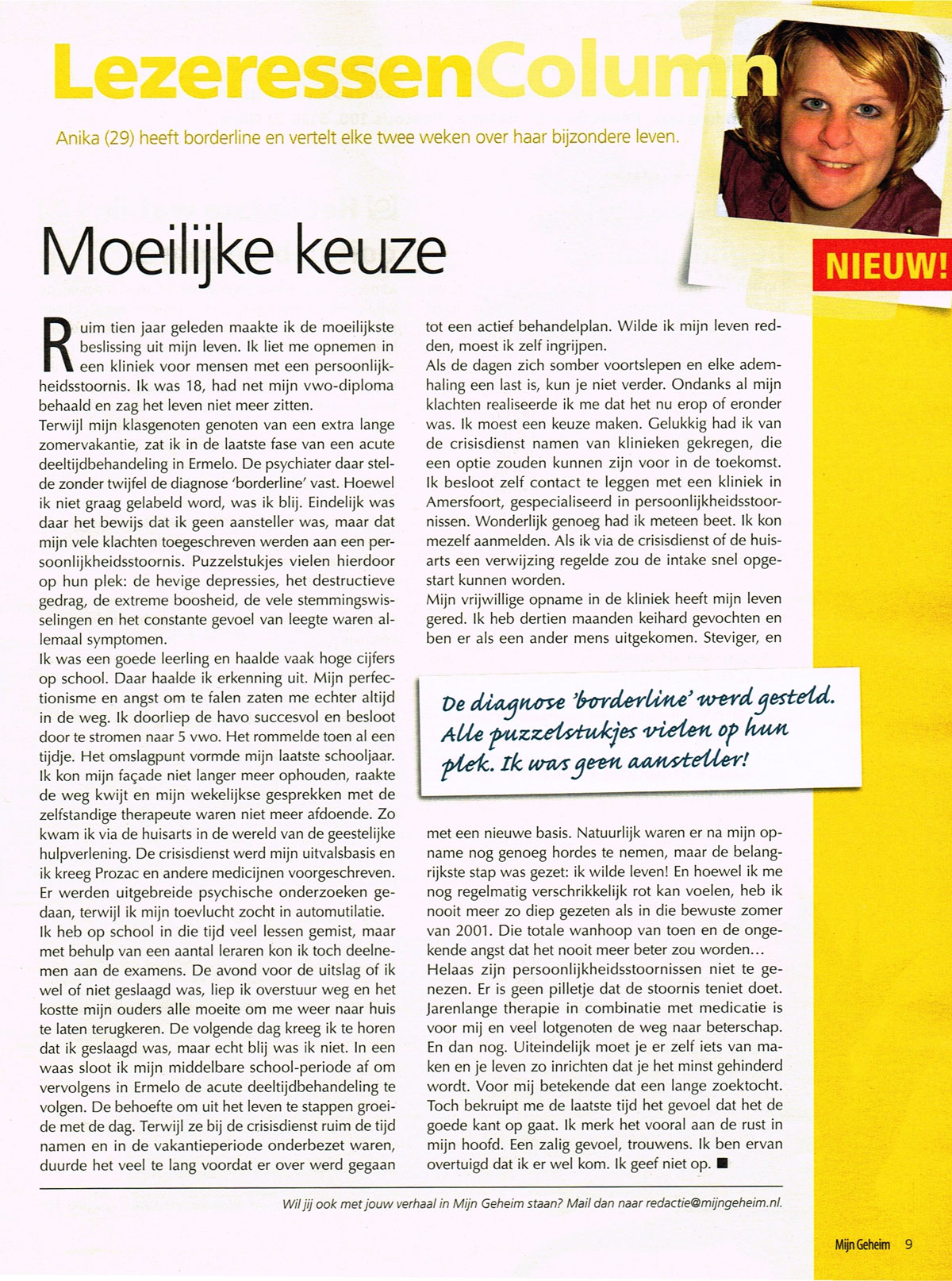 Terwijl mijn klasgenoten genoten van een extra lange zomervakantie, zat ik in de laatste fase van een acute deeltijdbehandeling in Ermelo. De psychiater daar stelde zonder twijfel de diagnose ‘borderline’ vast. Hoewel ik niet graag gelabeld word, was ik blij. Eindelijk was daar het bewijs dat ik geen aansteller was, maar dat mijn vele klachten toegeschreven werden aan een persoonlijkheidsstoornis. Puzzelstukjes vielen hierdoor op hun plek; de hevige depressies, het destructieve gedrag, de extreme boosheid, de vele stemmingswisselingen en het constante gevoel van leegte waren allemaal symptomen.