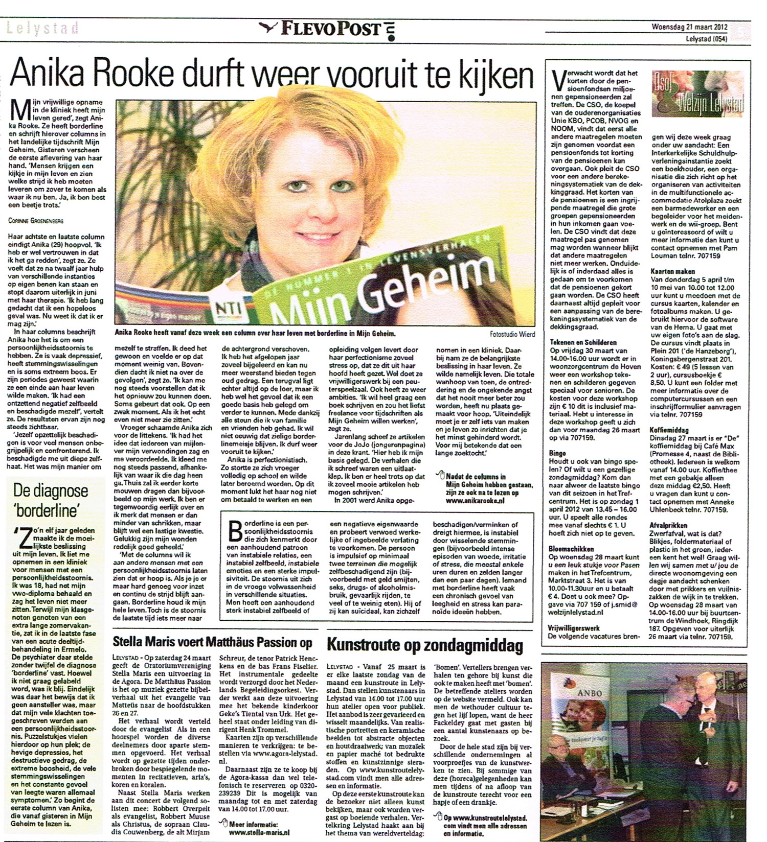 ‘Mijn vrijwillige opname in de kliniek heeft mijn leven gered’, zegt Anika Rooke. Ze heeft borderline en schrijft hierover columns in het landelijke tijdschrift Mijn Geheim. Gisteren verscheen de eerste aflevering van haar hand. ‘Mensen krijgen een kijkje in mijn leven en zien welke strijd ik heb moeten leveren om zover te komen als waar ik nu ben. Ja, ik ben best een beetje trots.’